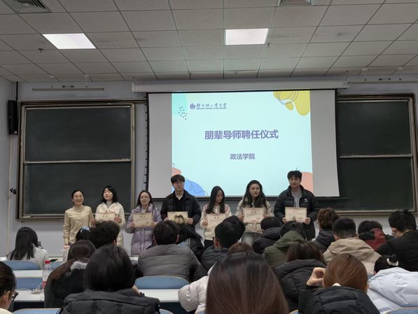 为健全学业指导与朋辈引领长效机制,深化全员、全过程、全方位育人格局,近日,政法皇冠体育 在东风校区教三楼204举办“心有榜样 行随朋辈”导师聘任仪式。辅导员、朋辈导师及2025级本科生参加。