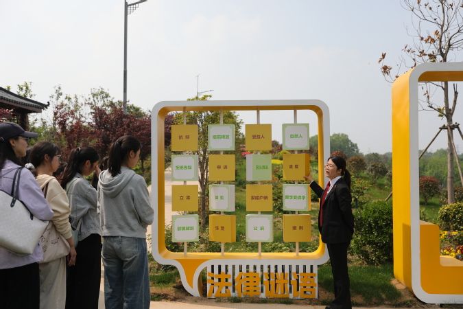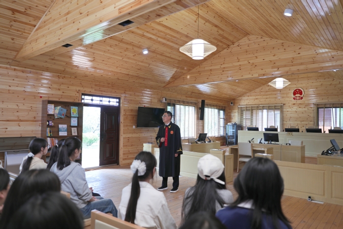法庭庭长王青热情接待师生一行并带领大家实地参观。先后介绍了法庭智能化便民设施,智能材料存储柜和智慧法庭,实时转录、自动生成笔录等功能,让大家真切体会到科技赋能司法的高效便捷。随后,师生漫步法治文化步道,在春意盎然的氛围中,通过趣味法律猜词游戏巩固法律常识,在沉浸式体验中感受法治文化的浓厚氛围。
